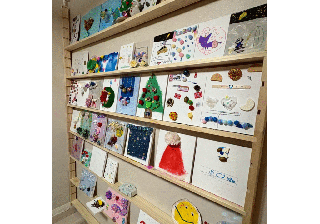 「アート教室の真似をして家でも制作を好きに作れるスペースを作りました」作品を飾ることで子どもたちの自己肯定感も上がった気がすると教えてくれました。=Tさん提供