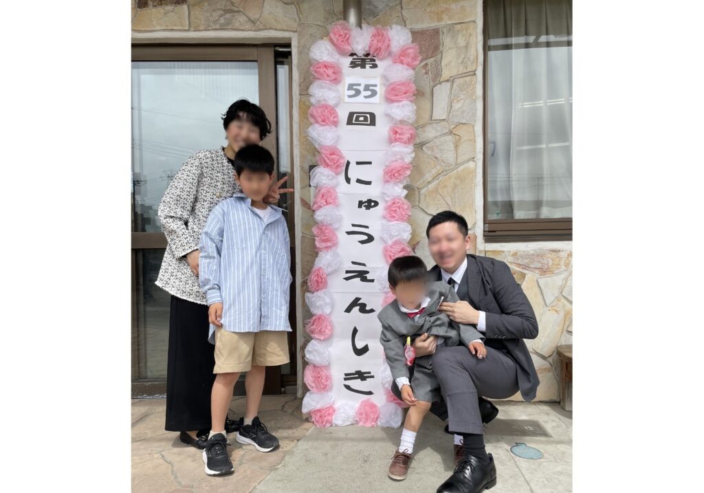 幼稚園の入園式。「5分くらいしか座れず式の間走り回る次男をずっと追いかけることになりました」=Nさん提供